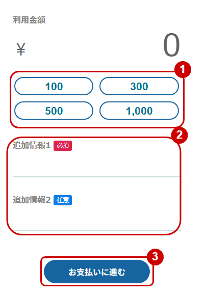 | 追加情報1、2 | 金額入力画面でお客様に追加入力していただく項目を2つまで設定できます。 項目名を指定すると、金額入力画面に項目名と入力欄が表示されます。 設定例:商品名、備考、メモなど |