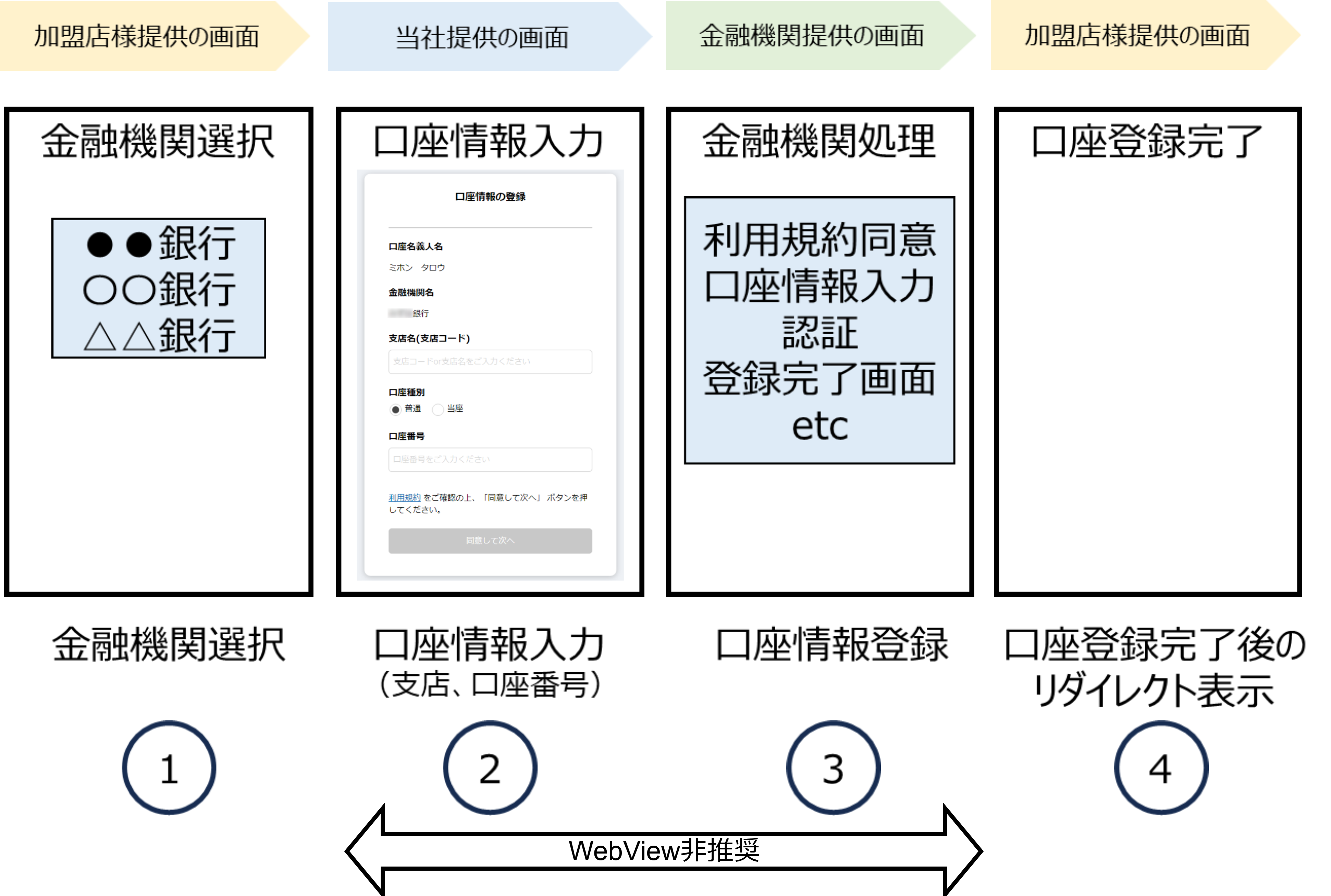 - 加盟店様はお客様を当サービスのBankDirectStart(口座登録手続き開始)APIに誘導します。
