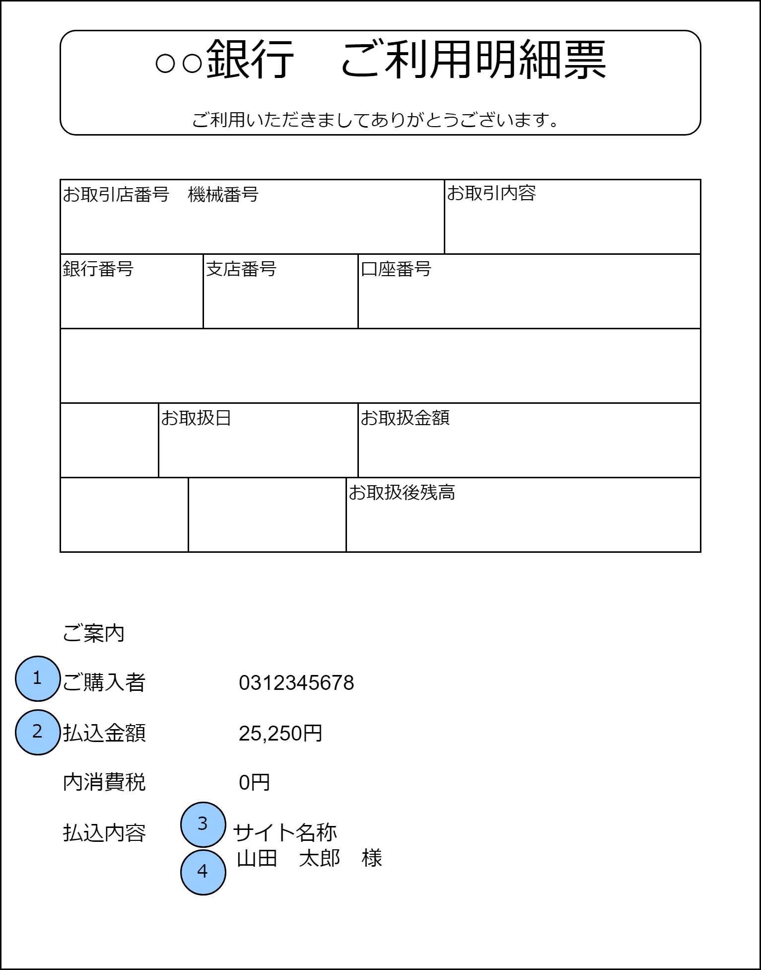 | 3 | 払込内容 | ・サイトコードがG00029でない場合 ご契約時のお申込書に記載されたサイト名称(12文字以内)が表示されます。 (変更する際はお手続きが必要です) ・サイトコードがG00029の場合 「収納代行会社GMO-PG」が表示されます。 |